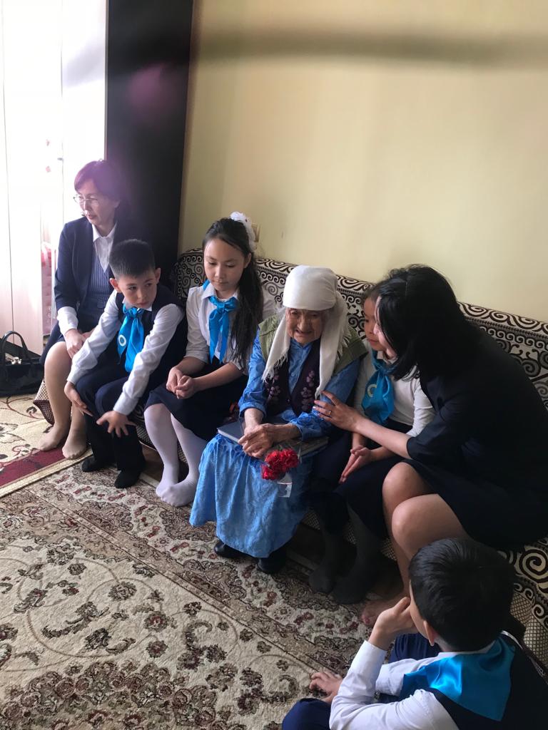 №19 Қ.Сәтпаев атындағы мектеп-гимназиясының әкімшілігі және «Жас Ұлан» ББЖҰ –ның оқушылары 7 мамыр Отан қорғаушылар күні, 9 мамыр Ұлы Жеңістің 74 жылдық мерекесіне орай еңбек ардагері Айжамал әжемен кездесті. Оқушыларды үлкенді құрметтеуге, сыйлауға үйрету мақсатында ұйымдастырылған кездесу барысында өнегелі әңгемелірмен сыр шертіліп, ұстаздармен оқушыларға бата берілді.